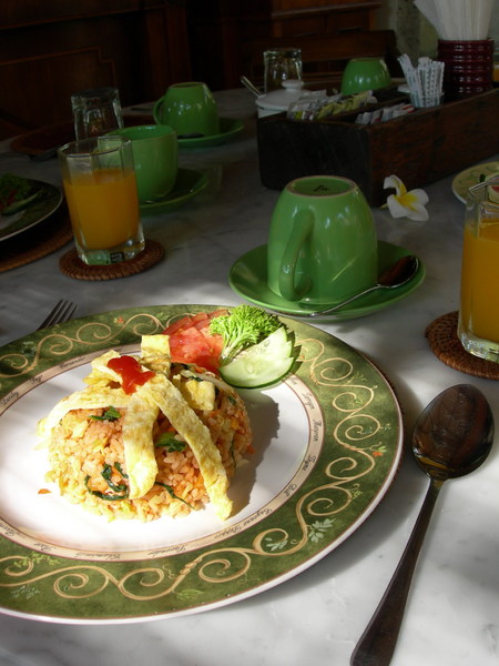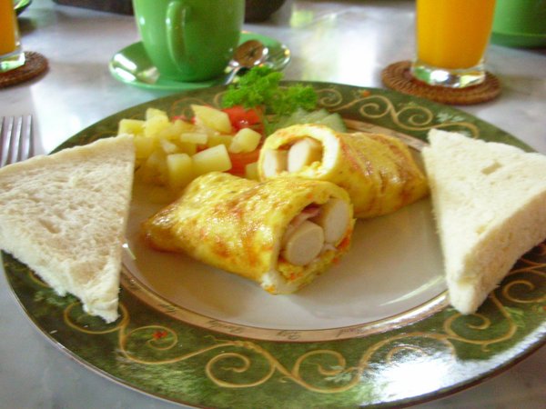 兩日的早餐,是極佳的美食雜誌拍攝題材,不過我自己吃不習慣,我為了填飽肚子並且入鄉隨俗還是吃光光;除了主食之外,還有一杯果汁或者茶飲。