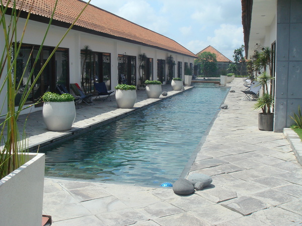 我們遷移了, 那是另一個可以當大爺的五星級飯店。白淨簡約的房舍加上一池長條泳道,這樣的飯店景色讓我們好似走入插圖當中(因為世界是一本書嘛)。而到了BALI你會注意到絕大多數的飯店你都是住一樓的,為什麼呢,這是因為當地政府規定,如果你要蓋房子,那房子不得超過椰子樹高,當地有90%居民信奉印度教,他們認為房子愈高,就會愈接近神,所以從機場到各景點,我們都可以看到小巧可愛的房子,而據我所知受到觀光業的影響,庫塔海灘邊有觀光飯店是突破這個限制的。